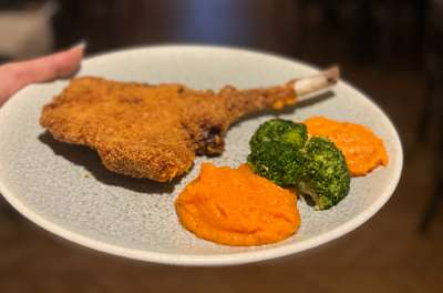 Alergeni: gluten, lactoză, soia / Ingrediente: piept pui (220g), făină (40g), ulei extravirgin de măsline (20g), produs de gătit pe bază de grăsimi vegetale (apă, grăsimi vegetale nehidrogenate din palmier 23%, zer praf, amidon modificat din porumb (E1442), maltodextrină, emulsifiant: lecitină de soia (E322), stabilizator: E412, E410, corector de aciditate: E339, colorant: E160a. Poate conține urme de arahide) (200g), parmezan (lapte, sare, cheag vegetal) (100g), orez (100g), avocado (100g), ulei extravirgin de măsline (10g), / Informații nutriționale / 100g: Valoare energetică: 850,13kJ / 203,02kcal, glucide: 15,48g, proteine: 12,35g, grăsimi: 9,67g, din care acizi grași saturați: 5,40g, fibre: 0,87g, zaharuri: 0,13g, sare: 2,97g. | 68 LEI 300 / 200 g |