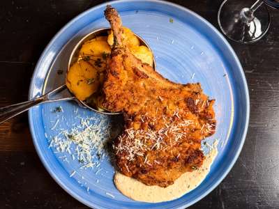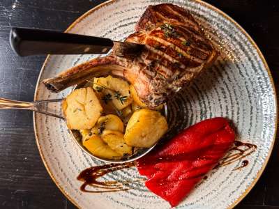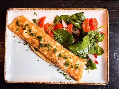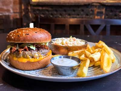 Cheeseburger Black Angus cu bacon crocant cartofi dippers și salatăcartofi dippers și salată