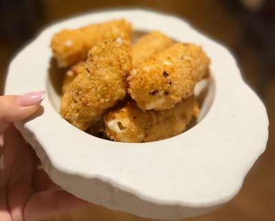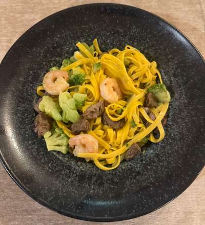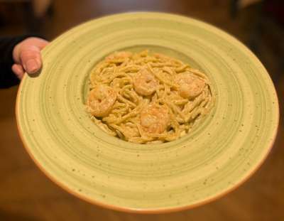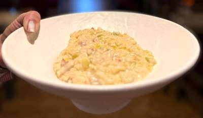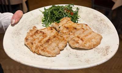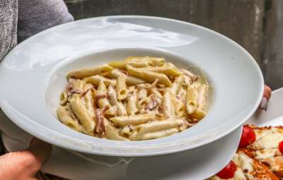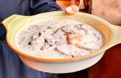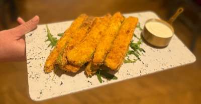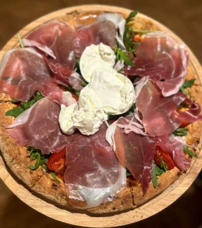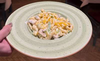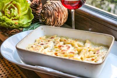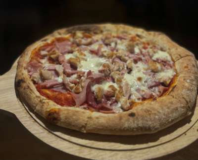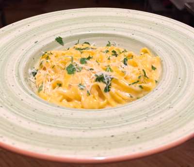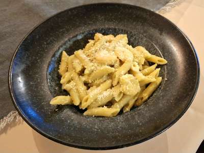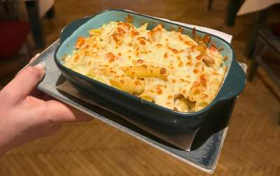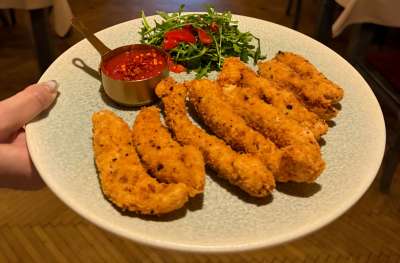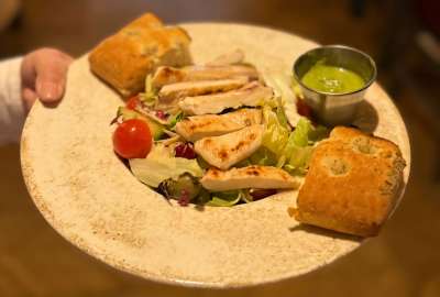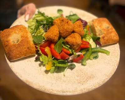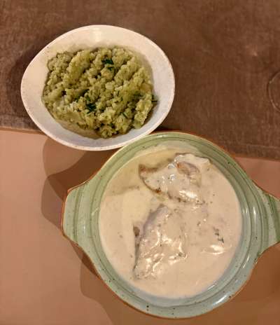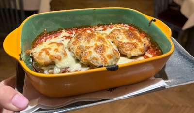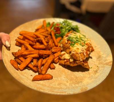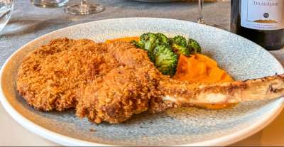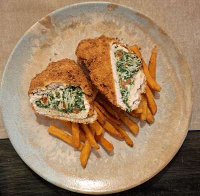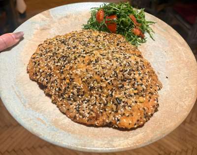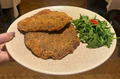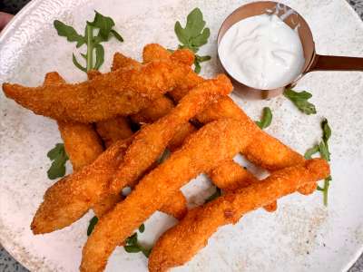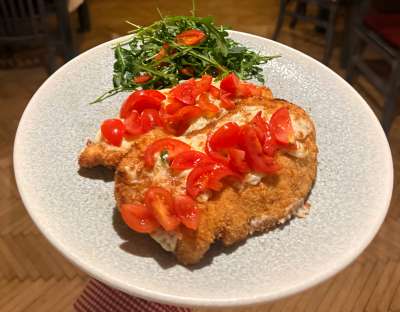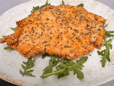 Alergeni: gluten, lactoză, soia / Ingrediente: piept pui (220g), făină (40g), ulei extravirgin de măsline (20g), produs de gătit pe bază de grăsimi vegetale (apă, grăsimi vegetale nehidrogenate din palmier 23%, zer praf, amidon modificat din porumb (E1442), maltodextrină, emulsifiant: lecitină de soia (E322), stabilizator: E412, E410, corector de aciditate: E339, colorant: E160a. Poate conține urme de arahide) (200g), parmezan (lapte, sare, cheag vegetal) (100g), orez (100g), avocado (100g), ulei extravirgin de măsline (10g), unt (10g) / Informații nutriționale / 100g: Valoare energetică: 850,13kJ / 203,02kcal, glucide: 15,48g, proteine: 12,35g, grăsimi: 9,67g, din care acizi grași saturați: 5,40g, fibre: 0,87g, zaharuri: 0,13g, sare: 2,97g. | 68 LEI 300 / 200 g |